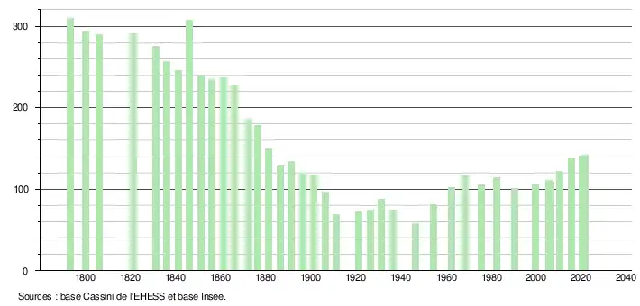 L'évolution du nombre d'habitants est connue à travers les recensements de la population effectués dans la commune depuis 1793. Pour les communes de moins de 10 000 habitants, une enquête de recensement portant sur toute la population est réalisée tous les cinq ans, les populations légales des années intermédiaires étant quant à elles estimées par interpolation ou extrapolation[20]. Pour la commune, le premier recensement exhaustif entrant dans le cadre du nouveau dispositif a été réalisé en 2005[21].