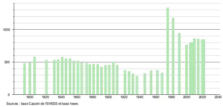 L'évolution du nombre d'habitants est connue à travers les recensements de la population effectués dans la commune depuis 1793. Pour les communes de moins de 10 000 habitants, une enquête de recensement portant sur toute la population est réalisée tous les cinq ans, les populations légales des années intermédiaires étant quant à elles estimées par interpolation ou extrapolation[26]. Pour la commune, le premier recensement exhaustif entrant dans le cadre du nouveau dispositif a été réalisé en 2004[27].