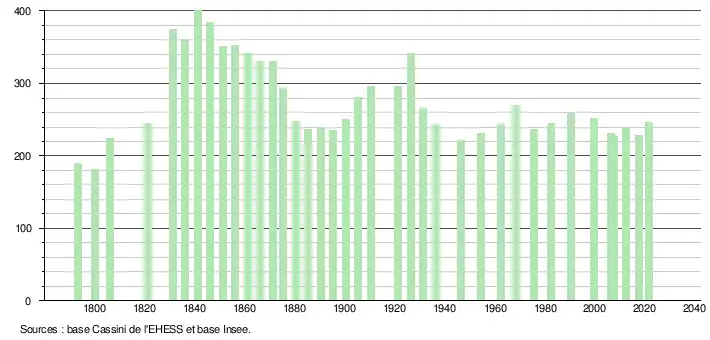 L'évolution du nombre d'habitants est connue à travers les recensements de la population effectués dans la commune depuis 1793. Pour les communes de moins de 10 000 habitants, une enquête de recensement portant sur toute la population est réalisée tous les cinq ans, les populations légales des années intermédiaires étant quant à elles estimées par interpolation ou extrapolation[20]. Pour la commune, le premier recensement exhaustif entrant dans le cadre du nouveau dispositif a été réalisé en 2007[21].