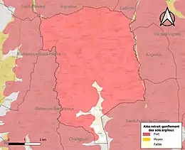 Le retrait-gonflement des sols argileux est susceptible d'engendrer des dommages importants aux bâtiments en cas d’alternance de périodes de sécheresse et de pluie. 94,6 % de la superficie communale est en aléa moyen ou fort (67,4 % au niveau départemental et 48,5 % au niveau national). Sur les 210 bâtiments dénombrés sur la commune en 2019, 195 sont en aléa moyen ou fort, soit 93 %, à comparer aux 81 % au niveau départemental et 54 % au niveau national. Une cartographie de l'exposition du territoire national au retrait gonflement des sols argileux est disponible sur le site du BRGM[18],[Carte 3].