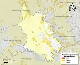 Le retrait-gonflement des sols argileux est susceptible d'engendrer des dommages importants aux bâtiments en cas d’alternance de périodes de sécheresse et de pluie[19]. 11,3 % de la superficie communale est en aléa moyen ou fort (27 % au niveau départemental et 48,5 % au niveau national métropolitain)[Carte 2]. Depuis le , en application de la loi ÉLAN, différentes contraintes s'imposent aux vendeurs, maîtres d'ouvrages ou constructeurs de biens situés dans une zone classée en aléa moyen ou fort[Note 3],[20].