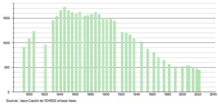 L'évolution du nombre d'habitants est connue à travers les recensements de la population effectués dans la commune depuis 1793. Pour les communes de moins de 10 000 habitants, une enquête de recensement portant sur toute la population est réalisée tous les cinq ans, les populations légales des années intermédiaires étant quant à elles estimées par interpolation ou extrapolation[25]. Pour la commune, le premier recensement exhaustif entrant dans le cadre du nouveau dispositif a été réalisé en 2008[26].