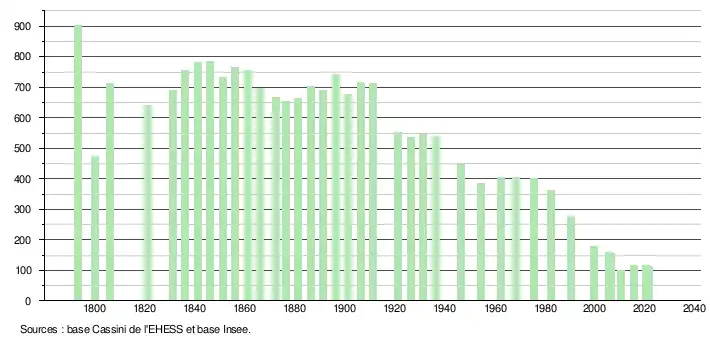 L'évolution du nombre d'habitants est connue à travers les recensements de la population effectués dans la commune depuis 1793. Pour les communes de moins de 10 000 habitants, une enquête de recensement portant sur toute la population est réalisée tous les cinq ans, les populations légales des années intermédiaires étant quant à elles estimées par interpolation ou extrapolation[15]. Pour la commune, le premier recensement exhaustif entrant dans le cadre du nouveau dispositif a été réalisé en 2005[16].