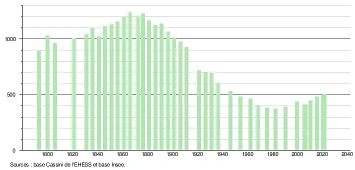 L'évolution du nombre d'habitants est connue à travers les recensements de la population effectués dans la commune depuis 1793. Pour les communes de moins de 10 000 habitants, une enquête de recensement portant sur toute la population est réalisée tous les cinq ans, les populations légales des années intermédiaires étant quant à elles estimées par interpolation ou extrapolation[18]. Pour la commune, le premier recensement exhaustif entrant dans le cadre du nouveau dispositif a été réalisé en 2005[19].