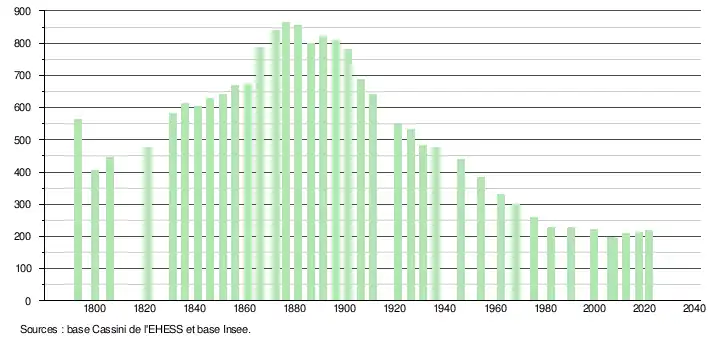 L'évolution du nombre d'habitants est connue à travers les recensements de la population effectués dans la commune depuis 1793. Pour les communes de moins de 10 000 habitants, une enquête de recensement portant sur toute la population est réalisée tous les cinq ans, les populations légales des années intermédiaires étant quant à elles estimées par interpolation ou extrapolation[17]. Pour la commune, le premier recensement exhaustif entrant dans le cadre du nouveau dispositif a été réalisé en 2007[18].