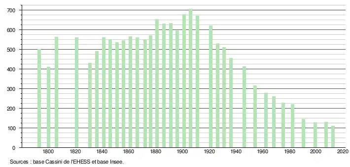 L'évolution du nombre d'habitants est connue à travers les recensements de la population effectués dans la commune depuis 1793. À partir du , les populations légales des communes sont publiées annuellement dans le cadre d'un recensement qui repose désormais sur une collecte d'information annuelle, concernant successivement tous les territoires communaux au cours d'une période de cinq ans. Pour les communes de moins de 10 000 habitants, une enquête de recensement portant sur toute la population est réalisée tous les cinq ans, les populations légales des années intermédiaires étant quant à elles estimées par interpolation ou extrapolation[3]. Pour la commune, le premier recensement exhaustif entrant dans le cadre du nouveau dispositif a été réalisé en 2007[4],[Note 1].