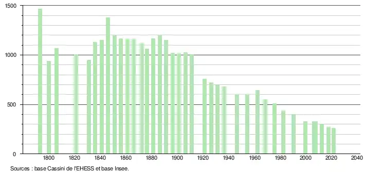 L'évolution du nombre d'habitants est connue à travers les recensements de la population effectués dans la commune depuis 1793. Pour les communes de moins de 10 000 habitants, une enquête de recensement portant sur toute la population est réalisée tous les cinq ans, les populations légales des années intermédiaires étant quant à elles estimées par interpolation ou extrapolation[12]. Pour la commune, le premier recensement exhaustif entrant dans le cadre du nouveau dispositif a été réalisé en 2007[13].