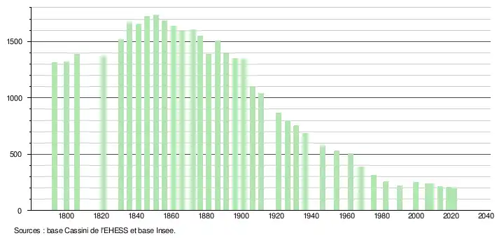 L'évolution du nombre d'habitants est connue à travers les recensements de la population effectués dans la commune depuis 1793. Pour les communes de moins de 10 000 habitants, une enquête de recensement portant sur toute la population est réalisée tous les cinq ans, les populations légales des années intermédiaires étant quant à elles estimées par interpolation ou extrapolation[19]. Pour la commune, le premier recensement exhaustif entrant dans le cadre du nouveau dispositif a été réalisé en 2008[20].