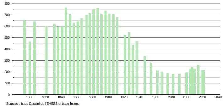 L'évolution du nombre d'habitants est connue à travers les recensements de la population effectués dans la commune depuis 1793. Pour les communes de moins de 10 000 habitants, une enquête de recensement portant sur toute la population est réalisée tous les cinq ans, les populations légales des années intermédiaires étant quant à elles estimées par interpolation ou extrapolation[25]. Pour la commune, le premier recensement exhaustif entrant dans le cadre du nouveau dispositif a été réalisé en 2004[26].