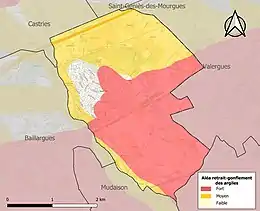 Le retrait-gonflement des sols argileux est susceptible d'engendrer des dommages importants aux bâtiments en cas d’alternance de périodes de sécheresse et de pluie. 93,1 % de la superficie communale est en aléa moyen ou fort (59,3 % au niveau départemental et 48,5 % au niveau national). Sur les 925 bâtiments dénombrés sur la commune en 2019, 575 sont en aléa moyen ou fort, soit 62 %, à comparer aux 85 % au niveau départemental et 54 % au niveau national. Une cartographie de l'exposition du territoire national au retrait gonflement des sols argileux est disponible sur le site du BRGM[17],[Carte 2].