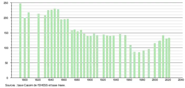 L'évolution du nombre d'habitants est connue à travers les recensements de la population effectués dans la commune depuis 1793. Pour les communes de moins de 10 000 habitants, une enquête de recensement portant sur toute la population est réalisée tous les cinq ans, les populations légales des années intermédiaires étant quant à elles estimées par interpolation ou extrapolation[21]. Pour la commune, le premier recensement exhaustif entrant dans le cadre du nouveau dispositif a été réalisé en 2007[22].