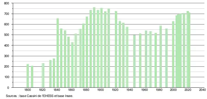 L'évolution du nombre d'habitants est connue à travers les recensements de la population effectués dans la commune depuis 1800. Pour les communes de moins de 10 000 habitants, une enquête de recensement portant sur toute la population est réalisée tous les cinq ans, les populations légales des années intermédiaires étant quant à elles estimées par interpolation ou extrapolation[20]. Pour la commune, le premier recensement exhaustif entrant dans le cadre du nouveau dispositif a été réalisé en 2004[21].