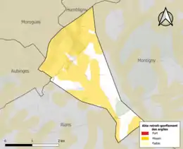 La commune est vulnérable au risque de mouvements de terrains constitué principalement du retrait-gonflement des sols argileux[15]. Cet aléa est susceptible d'engendrer des dommages importants aux bâtiments en cas d’alternance de périodes de sécheresse et de pluie. 69,1 % de la superficie communale est en aléa moyen ou fort (90 % au niveau départemental et 48,5 % au niveau national). Sur les 19 bâtiments dénombrés sur la commune en 2019, 10 sont en aléa moyen ou fort, soit 53 %, à comparer aux 83 % au niveau départemental et 54 % au niveau national. Une cartographie de l'exposition du territoire national au retrait gonflement des sols argileux est disponible sur le site du BRGM[16],[Carte 2].