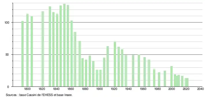 L'évolution du nombre d'habitants est connue à travers les recensements de la population effectués dans la commune depuis 1793. Pour les communes de moins de 10 000 habitants, une enquête de recensement portant sur toute la population est réalisée tous les cinq ans, les populations légales des années intermédiaires étant quant à elles estimées par interpolation ou extrapolation[18]. Pour la commune, le premier recensement exhaustif entrant dans le cadre du nouveau dispositif a été réalisé en 2004[19].