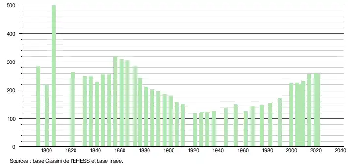 L'évolution du nombre d'habitants est connue à travers les recensements de la population effectués dans la commune depuis 1793. Pour les communes de moins de 10 000 habitants, une enquête de recensement portant sur toute la population est réalisée tous les cinq ans, les populations légales des années intermédiaires étant quant à elles estimées par interpolation ou extrapolation[28]. Pour la commune, le premier recensement exhaustif entrant dans le cadre du nouveau dispositif a été réalisé en 2004[29].