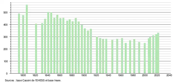 L'évolution du nombre d'habitants est connue à travers les recensements de la population effectués dans la commune depuis 1793. Pour les communes de moins de 10 000 habitants, une enquête de recensement portant sur toute la population est réalisée tous les cinq ans, les populations légales des années intermédiaires étant quant à elles estimées par interpolation ou extrapolation[29]. Pour la commune, le premier recensement exhaustif entrant dans le cadre du nouveau dispositif a été réalisé en 2008[30].