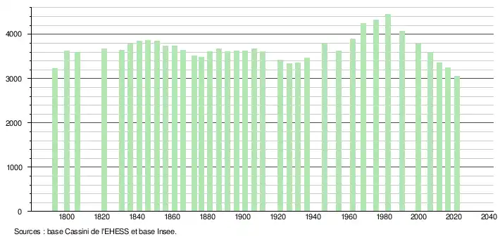 L'évolution du nombre d'habitants est connue à travers les recensements de la population effectués dans la commune depuis 1793. Pour les communes de moins de 10 000 habitants, une enquête de recensement portant sur toute la population est réalisée tous les cinq ans, les populations légales des années intermédiaires étant quant à elles estimées par interpolation ou extrapolation[28]. Pour la commune, le premier recensement exhaustif entrant dans le cadre du nouveau dispositif a été réalisé en 2006[29].