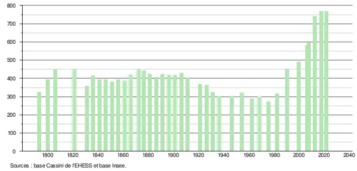 L'évolution du nombre d'habitants est connue à travers les recensements de la population effectués dans la commune depuis 1793. Pour les communes de moins de 10 000 habitants, une enquête de recensement portant sur toute la population est réalisée tous les cinq ans, les populations légales des années intermédiaires étant quant à elles estimées par interpolation ou extrapolation[22]. Pour la commune, le premier recensement exhaustif entrant dans le cadre du nouveau dispositif a été réalisé en 2007[23].