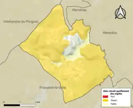 Le retrait-gonflement des sols argileux est susceptible d'engendrer des dommages importants aux bâtiments en cas d’alternance de périodes de sécheresse et de pluie. 89,5 % de la superficie communale est en aléa moyen ou fort (67,7 % au niveau départemental et 48,5 % au niveau national). Sur les 73 bâtiments dénombrés sur la commune en 2019, 66 sont en aléa moyen ou fort, soit 90 %, à comparer aux 72 % au niveau départemental et 54 % au niveau national. Une cartographie de l'exposition du territoire national au retrait gonflement des sols argileux est disponible sur le site du BRGM[19],[Carte 2].