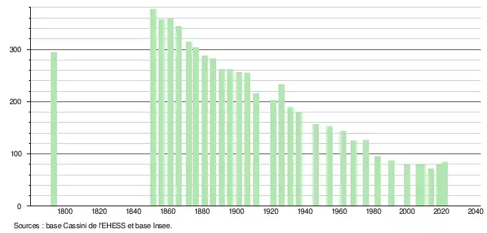 L'évolution du nombre d'habitants est connue à travers les recensements de la population effectués dans la commune depuis 1793. Pour les communes de moins de 10 000 habitants, une enquête de recensement portant sur toute la population est réalisée tous les cinq ans, les populations légales des années intermédiaires étant quant à elles estimées par interpolation ou extrapolation[25]. Pour la commune, le premier recensement exhaustif entrant dans le cadre du nouveau dispositif a été réalisé en 2008[26].