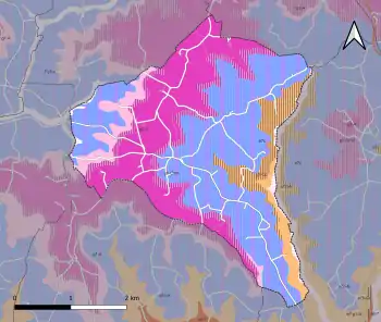 L'occupation des sols de la commune, telle qu'elle ressort de la base de données européenne d’occupation biophysique des sols Corine Land Cover (CLC), est marquée par l'importance des territoires agricoles (91,2 % en 2018), en augmentation par rapport à 1990 (88,7 %). La répartition détaillée en 2018 est la suivante : zones agricoles hétérogènes (50,8 %), terres arables (32,9 %), forêts (8,8 %), prairies (4,7 %), cultures permanentes (2,8 %)[30]. L'évolution de l’occupation des sols de la commune et de ses infrastructures peut être observée sur les différentes représentations cartographiques du territoire : la carte de Cassini (XVIIIe siècle), la carte d'état-major (1820-1866) et les cartes ou photos aériennes de l'IGN pour la période actuelle (1950 à aujourd'hui)[Carte 3].