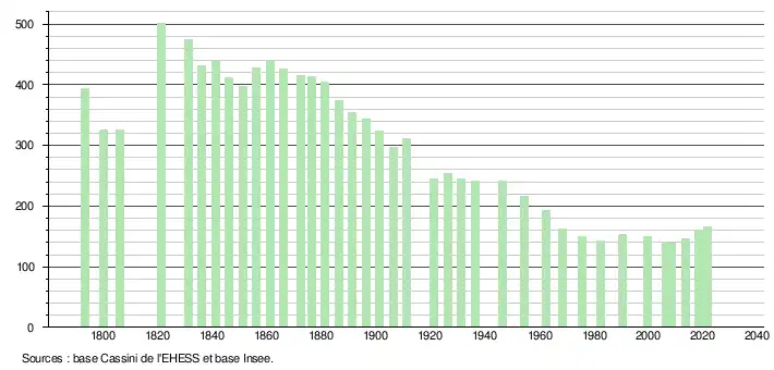 L'évolution du nombre d'habitants est connue à travers les recensements de la population effectués dans la commune depuis 1793. Pour les communes de moins de 10 000 habitants, une enquête de recensement portant sur toute la population est réalisée tous les cinq ans, les populations légales des années intermédiaires étant quant à elles estimées par interpolation ou extrapolation[46]. Pour la commune, le premier recensement exhaustif entrant dans le cadre du nouveau dispositif a été réalisé en 2008[47].