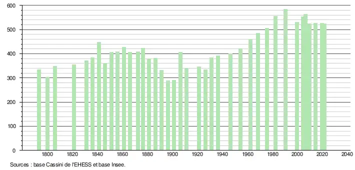 - Population municipale légale en vigueur au 1er janvier 2024, millésimée 2021, définie dans les limites territoriales en vigueur au 1er janvier 2023, date de référence statistique : 1er janvier 2021.