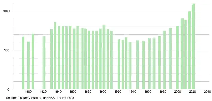 L'évolution du nombre d'habitants est connue à travers les recensements de la population effectués dans la commune depuis 1793. Pour les communes de moins de 10 000 habitants, une enquête de recensement portant sur toute la population est réalisée tous les cinq ans, les populations légales des années intermédiaires étant quant à elles estimées par interpolation ou extrapolation[21]. Pour la commune, le premier recensement exhaustif entrant dans le cadre du nouveau dispositif a été réalisé en 2005[22].