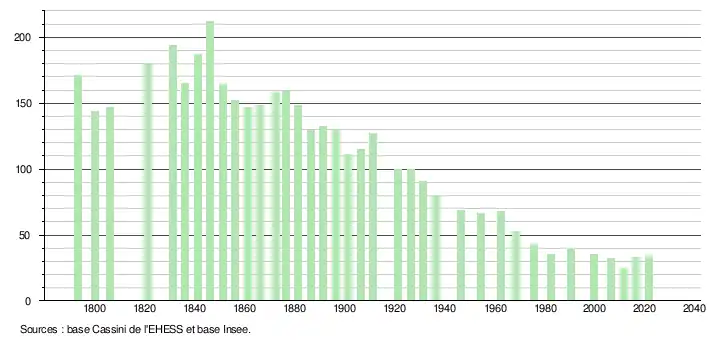 L'évolution du nombre d'habitants est connue à travers les recensements de la population effectués dans la commune depuis 1793. Pour les communes de moins de 10 000 habitants, une enquête de recensement portant sur toute la population est réalisée tous les cinq ans, les populations légales des années intermédiaires étant quant à elles estimées par interpolation ou extrapolation[47]. Pour la commune, le premier recensement exhaustif entrant dans le cadre du nouveau dispositif a été réalisé en 2006[48].