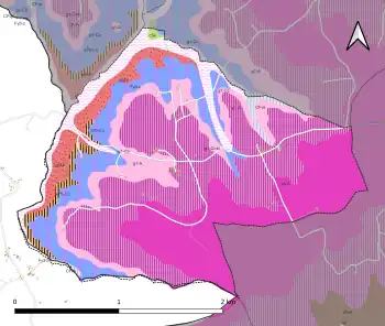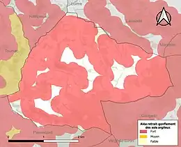 Les mouvements de terrains susceptibles de se produire sur la commune sont des tassements différentiels[38]. Le retrait-gonflement des sols argileux est susceptible d'engendrer des dommages importants aux bâtiments en cas d’alternance de périodes de sécheresse et de pluie[39]. 86,7 % de la superficie communale est en aléa moyen ou fort (58,6 % au niveau départemental et 48,5 % au niveau national métropolitain)[Carte 4]. Depuis le , en application de la loi ÉLAN, différentes contraintes s'imposent aux vendeurs, maîtres d'ouvrages ou constructeurs de biens situés dans une zone classée en aléa moyen ou fort[Note 4],[40].
