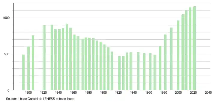 L'évolution du nombre d'habitants est connue à travers les recensements de la population effectués dans la commune depuis 1793. Pour les communes de moins de 10 000 habitants, une enquête de recensement portant sur toute la population est réalisée tous les cinq ans, les populations légales des années intermédiaires étant quant à elles estimées par interpolation ou extrapolation[23]. Pour la commune, le premier recensement exhaustif entrant dans le cadre du nouveau dispositif a été réalisé en 2005[24].
