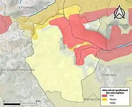 La commune est vulnérable au risque de mouvements de terrains constitué principalement du retrait-gonflement des sols argileux[22]. Cet aléa est susceptible d'engendrer des dommages importants aux bâtiments en cas d’alternance de périodes de sécheresse et de pluie. 35,3 % de la superficie communale est en aléa moyen ou fort (26,8 % au niveau départemental et 48,5 % au niveau national). Sur les 307 bâtiments dénombrés sur la commune en 2019, 232 sont en aléa moyen ou fort, soit 76 %, à comparer aux 36 % au niveau départemental et 54 % au niveau national. Une cartographie de l'exposition du territoire national au retrait gonflement des sols argileux est disponible sur le site du BRGM[23],[Carte 2].
