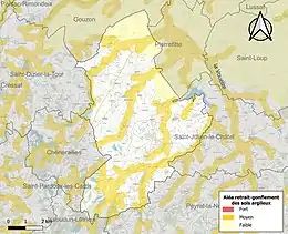 Le retrait-gonflement des sols argileux est susceptible d'engendrer des dommages importants aux bâtiments en cas d’alternance de périodes de sécheresse et de pluie. 30,2 % de la superficie communale est en aléa moyen ou fort (33,6 % au niveau départemental et 48,5 % au niveau national). Sur les 250 bâtiments dénombrés sur la commune en 2019, 62 sont en aléa moyen ou fort, soit 25 %, à comparer aux 25 % au niveau départemental et 54 % au niveau national. Une cartographie de l'exposition du territoire national au retrait gonflement des sols argileux est disponible sur le site du BRGM[23],[Carte 2].