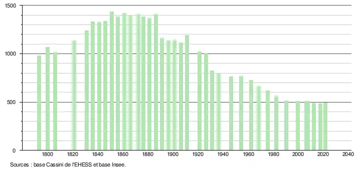 L'évolution du nombre d'habitants est connue à travers les recensements de la population effectués dans la commune depuis 1793. Pour les communes de moins de 10 000 habitants, une enquête de recensement portant sur toute la population est réalisée tous les cinq ans, les populations légales des années intermédiaires étant quant à elles estimées par interpolation ou extrapolation[25]. Pour la commune, le premier recensement exhaustif entrant dans le cadre du nouveau dispositif a été réalisé en 2007[26].