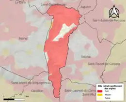 Le retrait-gonflement des sols argileux est susceptible d'engendrer des dommages importants aux bâtiments en cas d’alternance de périodes de sécheresse et de pluie. 89 % de la superficie communale est en aléa moyen ou fort (67,5 % au niveau départemental et 48,5 % au niveau national). Sur les 125 bâtiments dénombrés sur la commune en 2019, 80 sont en aléa moyen ou fort, soit 64 %, à comparer aux 90 % au niveau départemental et 54 % au niveau national. Une cartographie de l'exposition du territoire national au retrait gonflement des sols argileux est disponible sur le site du BRGM[18],[Carte 2].