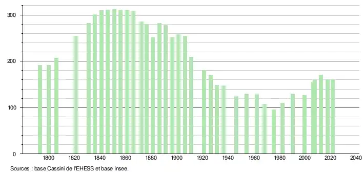 L'évolution du nombre d'habitants est connue à travers les recensements de la population effectués dans la commune depuis 1793. Pour les communes de moins de 10 000 habitants, une enquête de recensement portant sur toute la population est réalisée tous les cinq ans, les populations légales des années intermédiaires étant quant à elles estimées par interpolation ou extrapolation[22]. Pour la commune, le premier recensement exhaustif entrant dans le cadre du nouveau dispositif a été réalisé en 2007[23].