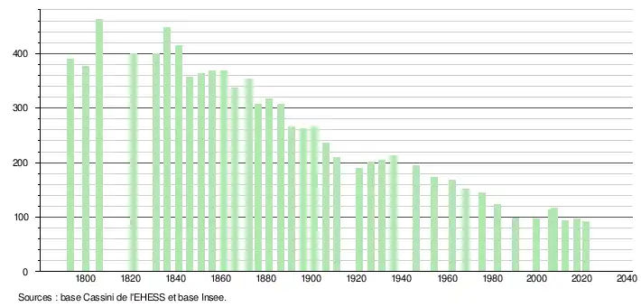 L'évolution du nombre d'habitants est connue à travers les recensements de la population effectués dans la commune depuis 1793. Pour les communes de moins de 10 000 habitants, une enquête de recensement portant sur toute la population est réalisée tous les cinq ans, les populations légales des années intermédiaires étant quant à elles estimées par interpolation ou extrapolation[26]. Pour la commune, le premier recensement exhaustif entrant dans le cadre du nouveau dispositif a été réalisé en 2007[27].