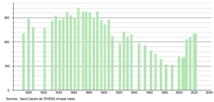 L'évolution du nombre d'habitants est connue à travers les recensements de la population effectués dans la commune depuis 1793. Pour les communes de moins de 10 000 habitants, une enquête de recensement portant sur toute la population est réalisée tous les cinq ans, les populations légales des années intermédiaires étant quant à elles estimées par interpolation ou extrapolation[24]. Pour la commune, le premier recensement exhaustif entrant dans le cadre du nouveau dispositif a été réalisé en 2004[25].