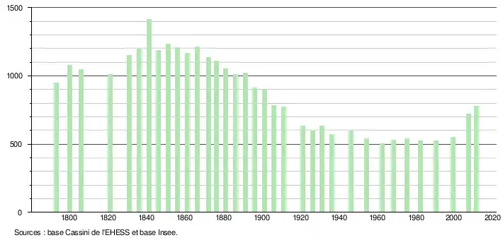 - Dans le tableau des recensements et le graphique, par convention dans Wikipédia, le principe a été retenu, pour les populations légales postérieures à 1999 de n’afficher dans le tableau des recensements et le graphique que les populations correspondant à l'année 2006, première population légale publiée calculée conformément aux concepts définis dans le décret no 2003-485 du 5 juin 2003, et les années correspondant à une enquête exhaustive de recensement pour les communes de moins de 10 000 habitants, ainsi que la dernière population légale publiée par l’Insee.