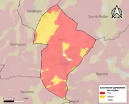 Le retrait-gonflement des sols argileux est susceptible d'engendrer des dommages importants aux bâtiments en cas d’alternance de périodes de sécheresse et de pluie. 99,6 % de la superficie communale est en aléa moyen ou fort (84,7 % au niveau départemental et 48,5 % au niveau national). Sur les 286 bâtiments dénombrés sur la commune en 2019, 286 sont en aléa moyen ou fort, soit 100 %, à comparer aux 86 % au niveau départemental et 54 % au niveau national. Une cartographie de l'exposition du territoire national au retrait gonflement des sols argileux est disponible sur le site du BRGM[23],[24].