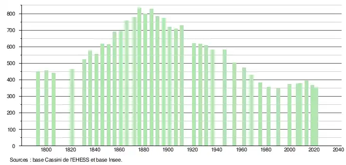 L'évolution du nombre d'habitants est connue à travers les recensements de la population effectués dans la commune depuis 1793. Pour les communes de moins de 10 000 habitants, une enquête de recensement portant sur toute la population est réalisée tous les cinq ans, les populations légales des années intermédiaires étant quant à elles estimées par interpolation ou extrapolation[33]. Pour la commune, le premier recensement exhaustif entrant dans le cadre du nouveau dispositif a été réalisé en 2008[34].