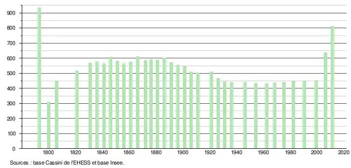 L'évolution du nombre d'habitants est connue à travers les recensements de la population effectués dans la commune depuis 1793. À partir du , les populations légales des communes sont publiées annuellement dans le cadre d'un recensement qui repose désormais sur une collecte d'information annuelle, concernant successivement tous les territoires communaux au cours d'une période de cinq ans. Pour les communes de moins de 10 000 habitants, une enquête de recensement portant sur toute la population est réalisée tous les cinq ans, les populations légales des années intermédiaires étant quant à elles estimées par interpolation ou extrapolation[28]. Pour la commune, le premier recensement exhaustif entrant dans le cadre du nouveau dispositif a été réalisé en 2006[29],[Note 2].