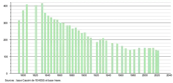L'évolution du nombre d'habitants est connue à travers les recensements de la population effectués dans la commune depuis 1793. Pour les communes de moins de 10 000 habitants, une enquête de recensement portant sur toute la population est réalisée tous les cinq ans, les populations légales des années intermédiaires étant quant à elles estimées par interpolation ou extrapolation[18]. Pour la commune, le premier recensement exhaustif entrant dans le cadre du nouveau dispositif a été réalisé en 2008[19].