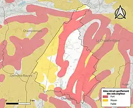 Les mouvements de terrains susceptibles de se produire sur la commune sont des tassements différentiels[17]. Le retrait-gonflement des sols argileux est susceptible d'engendrer des dommages importants aux bâtiments en cas d’alternance de périodes de sécheresse et de pluie[18]. 71,6 % de la superficie communale est en aléa moyen ou fort (54,9 % au niveau départemental et 48,5 % au niveau national)[Carte 2]. Depuis le , en application de la loi ELAN, différentes contraintes s'imposent aux vendeurs, maîtres d'ouvrages ou constructeurs de biens situés dans une zone classée en aléa moyen ou fort[Note 3],[19].