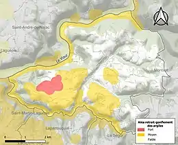 La commune est vulnérable au risque de mouvements de terrains constitué principalement du retrait-gonflement des sols argileux[27]. Cet aléa est susceptible d'engendrer des dommages importants aux bâtiments en cas d’alternance de périodes de sécheresse et de pluie. 34,4 % de la superficie communale est en aléa moyen ou fort (76,3 % au niveau départemental et 48,5 % au niveau national). Sur les 127 bâtiments dénombrés sur la commune en 2019, 76 sont en aléa moyen ou fort, soit 60 %, à comparer aux 90 % au niveau départemental et 54 % au niveau national. Une cartographie de l'exposition du territoire national au retrait gonflement des sols argileux est disponible sur le site du BRGM[28],[Carte 3].