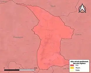 Le retrait-gonflement des sols argileux est susceptible d'engendrer des dommages importants aux bâtiments en cas d’alternance de périodes de sécheresse et de pluie. La totalité de la commune est en aléa moyen ou fort (67,4 % au niveau départemental et 48,5 % au niveau national). Sur les 103 bâtiments dénombrés sur la commune en 2019, 103 sont en aléa moyen ou fort, soit 100 %, à comparer aux 84 % au niveau départemental et 54 % au niveau national. Une cartographie de l'exposition du territoire national au retrait gonflement des sols argileux est disponible sur le site du BRGM[18],[Carte 2].