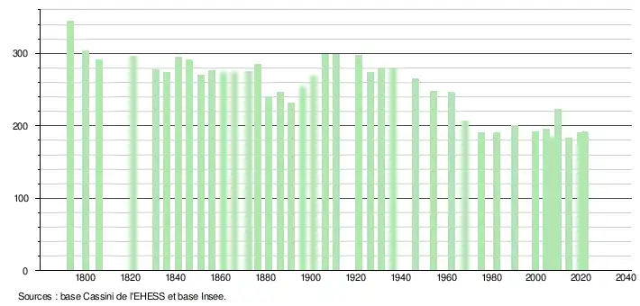 L'évolution du nombre d'habitants est connue à travers les recensements de la population effectués dans la commune depuis 1793. Pour les communes de moins de 10 000 habitants, une enquête de recensement portant sur toute la population est réalisée tous les cinq ans, les populations légales des années intermédiaires étant quant à elles estimées par interpolation ou extrapolation[19]. Pour la commune, le premier recensement exhaustif entrant dans le cadre du nouveau dispositif a été réalisé en 2004[20].