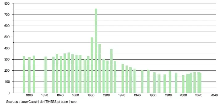 L'évolution du nombre d'habitants est connue à travers les recensements de la population effectués dans la commune depuis 1793. Pour les communes de moins de 10 000 habitants, une enquête de recensement portant sur toute la population est réalisée tous les cinq ans, les populations légales des années intermédiaires étant quant à elles estimées par interpolation ou extrapolation[14]. Pour la commune, le premier recensement exhaustif entrant dans le cadre du nouveau dispositif a été réalisé en 2004[15].