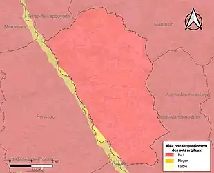 Le retrait-gonflement des sols argileux est susceptible d'engendrer des dommages importants aux bâtiments en cas d’alternance de périodes de sécheresse et de pluie. La totalité de la commune est en aléa moyen ou fort (67,4 % au niveau départemental et 48,5 % au niveau national). Sur les 552 bâtiments dénombrés sur la commune en 2019, 552 sont en aléa moyen ou fort, soit 100 %, à comparer aux 84 % au niveau départemental et 54 % au niveau national. Une cartographie de l'exposition du territoire national au retrait gonflement des sols argileux est disponible sur le site du BRGM[18],[Carte 2].