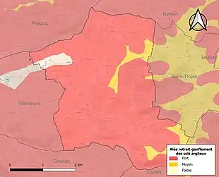Le retrait-gonflement des sols argileux est susceptible d'engendrer des dommages importants aux bâtiments en cas d’alternance de périodes de sécheresse et de pluie. 97,7 % de la superficie communale est en aléa moyen ou fort (67,4 % au niveau départemental et 48,5 % au niveau national). Sur les 370 bâtiments dénombrés sur la commune en 2019, 358 sont en aléa moyen ou fort, soit 97 %, à comparer aux 84 % au niveau départemental et 54 % au niveau national. Une cartographie de l'exposition du territoire national au retrait gonflement des sols argileux est disponible sur le site du BRGM[16],[Carte 2].